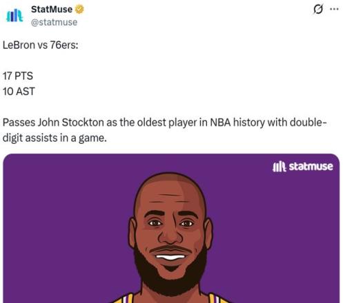 尽管状态低迷,但41岁38天的詹姆斯还是超越斯托克顿(41岁19天),成为NBA历史上单场助攻上双最老球员。