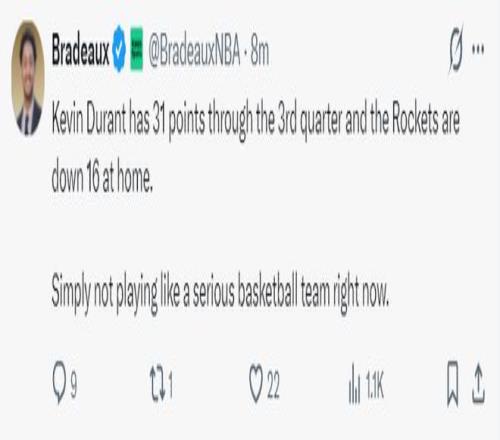 第三节的杜兰特已经竭尽全力,火箭的整体防守表现不佳,拼抢篮板球的积极性也不佳,杜兰特单节9中6爆砍15分1篮板1抢断分差还进一步被拉开,三节打完杜兰特31分钟拿到31分5抢断,这样的攻防表现都无法帮助球队缩小分差。